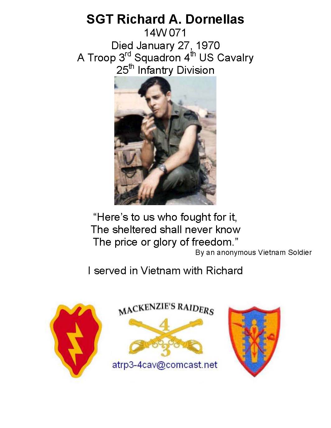 SSG Richard A Dornellas died January 27, 1970 22 yrs old from FL.